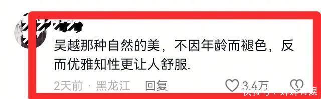 她妆容干净清爽,又能突出人物特点,而且肤色也很自然,脸更没有科技与狠活。 有网友说,“ 吴越那种自然的美,不因年龄而褪色,反而优雅知性更让人舒服 ”。